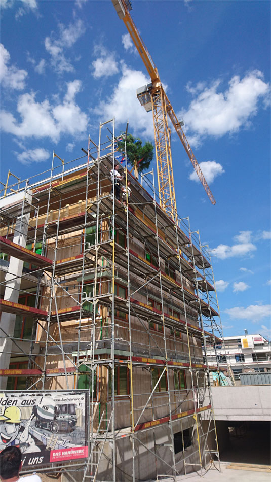 Auf ein neu erstelltes Untergeschoss mit Tiefgarage wurden vier 4-geschossige Wohngebäude aufgesetzt. Besonderheit dieses Bauwerks ist die Holz-Beton-Hybridbauweise.